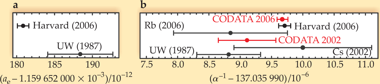 Figure 1. (a) A new measurement of the electron’s anomalous magnetic moment a e by Gerald Gabrielse’s group at Harvard University significantly improves on the 1987 measurement done at the University of Washington. (b) The new value of a e is the key input datum for determining the fine structure constant α. Shown here are the values of α–1 calculated from the a e measurements using current quantum electrodynamics theory, along with the values determined from atomic recoil experiments with rubidium and cesium and the recommended value from the 2002 and 2006 CODATA adjustments.