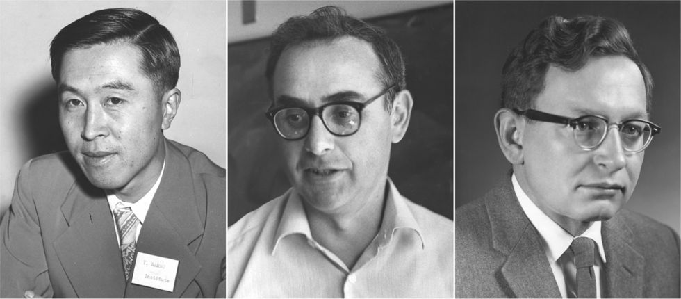 Figure 1. Yoichiro Nambu, Jeffrey Goldstone, and Philip Anderson penned important early chapters in the story of the Higgs boson. Beginning in 1960, particle physicists Nambu (left) and Goldstone (center) adapted ideas from condensed-matter physics to explore the relationship of symmetry breaking to the generation of massive particles. Two years later, condensed-matter physicist Anderson (right) argued that two types of troubling massless particles—Goldstone bosons and gauge bosons—could together yield a massive particle. (Nambu photo courtesy of the AIP Emilio Segrè Visual Archives, Marshak Collection. Goldstone and Anderson photos courtesy of the AIP Emilio Segrè Visual Archives, Physics Today Collection.)