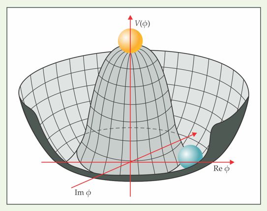 He discussed a complex (that is, having real and imaginary parts) self-interacting spinless boson field. (A boson field, in general, corresponds to a particle with integer spin.) The self-interactions are encoded in the shape of the potential energy density of the field, which, in Goldstone’s formulation, had the Mexican-hat shape shown in figure 2. One might expect that the vacuum of the theory is the state for which the expectation value of the field vanishes. But as the figure shows, the lowest-energy states of the theory correspond to the boson field having a nonvanishing value dependent on an arbitrary phase.