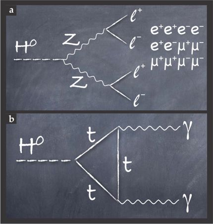 Figure 3. Two crucial decay channels revealed the Higgs boson in experiments conducted at CERN. (a) The Higgs boson decays into two virtual Z bosons, and each Z boson decays into an electron–positron pair or a muon–antimuon pair. (The four daughters are called leptons, whence the symbol ℓ.) The possible four-lepton final states are indicated to the right of the panel. (b) The Higgs boson decays into two photons (γ). Note that the decay proceeds through a triangle of virtual top quarks (t).