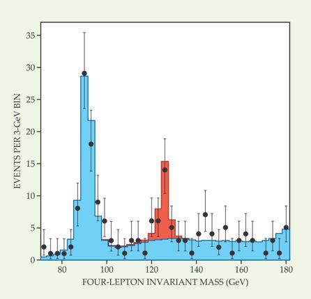 Figure 4. A Higgs boson peak at a mass of 126 GeV/c2 rises above background in these data obtained by the Compact Muon Solenoid collaboration. In this plot, the horizontal axis represents the relativistically invariant mass of four leptons produced in proton–proton collisions at CERN’s Large Hadron Collider. The blue histogram represents expected background, including extremely rare four-lepton decays of the Z boson, whose mass is 91 GeV/c2. The red histogram shows the expected events arising from a 126-GeV/c2 Higgs boson. The experimental data (black points) clearly exceed background near 126 GeV/c2 and agree with the Higgs-based expectations. (Adapted from ref. 11, CMS collaboration.)