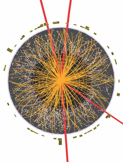 This candidate event for Higgs decay into four muons was observed by the ATLAS detector in June 2012. (Courtesy of the ATLAS collaboration.)