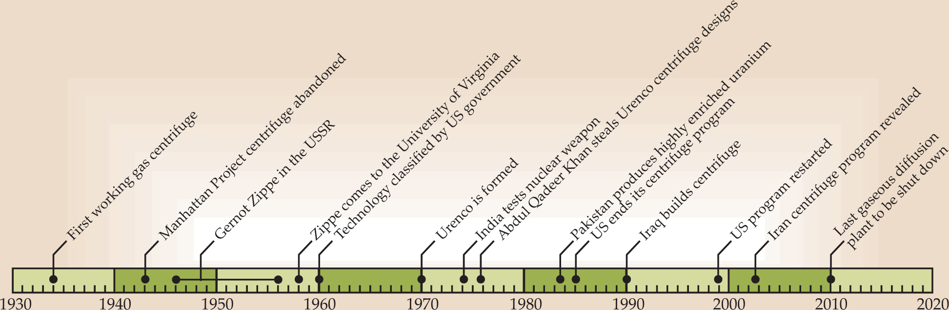 The separation of isotopes by gas centrifugation was first suggested by Frederick Lindemann and Francis Aston in 1919, immediately after the existence of isotopes had been experimentally confirmed. 2 Robert Mulliken in the US, William Harkins in Germany, and Sydney Chapman in the UK tried unsuccessful experiments for more than a decade. It wasn’t until 1934 that Jesse Beams of the University of Virginia first reported the successful separation by centrifuge with the isotopes of chlorine. His insight was to place the centrifuge rotor in a vacuum to thermally isolate it from the environment and thereby minimize the convective mixing that had foiled earlier attempts. Figure 2 shows a timeline of the centrifuge’s history.