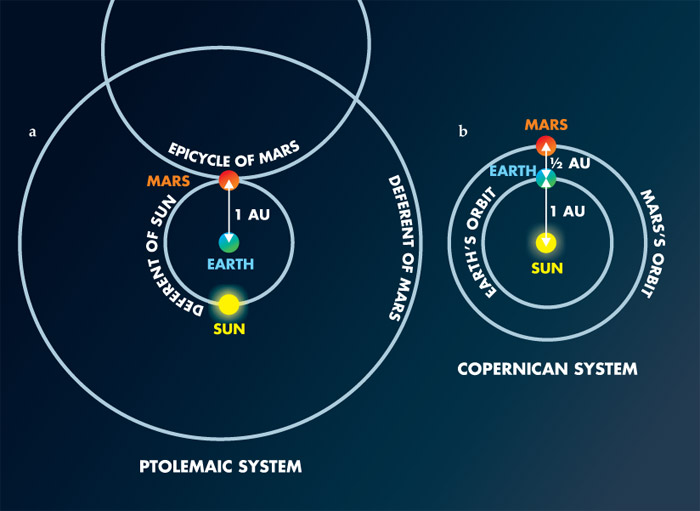 Figure 1. (a) In the Ptolemaic system, a planet moves in a circle, or epicycle, that in turn is carried along a larger circle, or deferent. Mars’s epicycle is 2⁄3 the size of its deferent, and the minimum Earth–Mars distance, when Mars is in opposition to the Sun, is 1 AU. (b) In the Copernican system, Earth’s orbit is 2⁄3 as large as Mars’s orbit. The minimum distance between them—ignoring the eccentric placement of Mars’s orbit—is thus 1⁄2 AU. In the 1580s Tycho Brahe hoped to distinguish between the two systems by measuring the distance to Mars. Unfortunately, the planetary system was 20 times larger than astronomers of the time realized, which made naked-eye measurements inadequate.