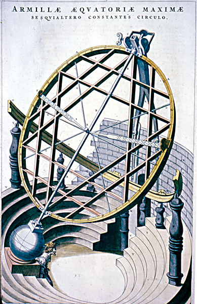 Figure 2. The equatorial armillary, Tycho’s most impressive instrument, completed in 1585. The tilted axis running through the large (2.7-m wide) circle is parallel with Earth’s axis. The circle is calibrated with 90° at the poles and 0° at the midpoint of its circumference. Two sighting arms establish the declination, the angular distance (north or south) of a star from the equator. Tycho could use one sighting arm to read the declination of a star or planet and then, in less than a minute’s time, rotate the circle 180° about the tilted axis to make a second independent determination with the other arm. (Published in 1662 and based on Tycho’s original version, this illustration is by Willem Blaeu, a former assistant at Tycho’s Hven observatory.)