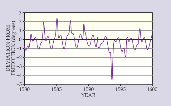 Figure 3. Errors in the predicted celestial longitudes of Mars derived from the Copernican-based Prutenic Tables. The errors closely repeat after 32 years. The large Martian catastrophe error of nearly 5° took place in 1593 and was repeated in 1625.