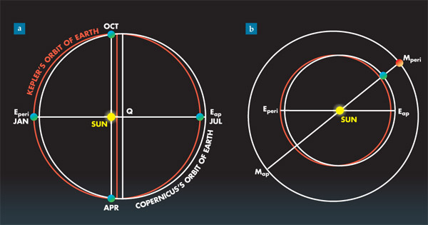 Kepler soon discovered that the problem wasn’t with Mars at all, but arose entirely with the orbit assigned to Earth. Contrary to today’s widespread but uninformed opinion, the system proposed by Nicolaus Copernicus held that planets did not revolve in circular orbits centered on the Sun. Rather, they moved in eccentrically placed orbits—faster when closer to the Sun. Earth was the sole exception; it was thought to have an eccentric orbit and yet move at constant speed. And that, Kepler thought, had to be wrong.