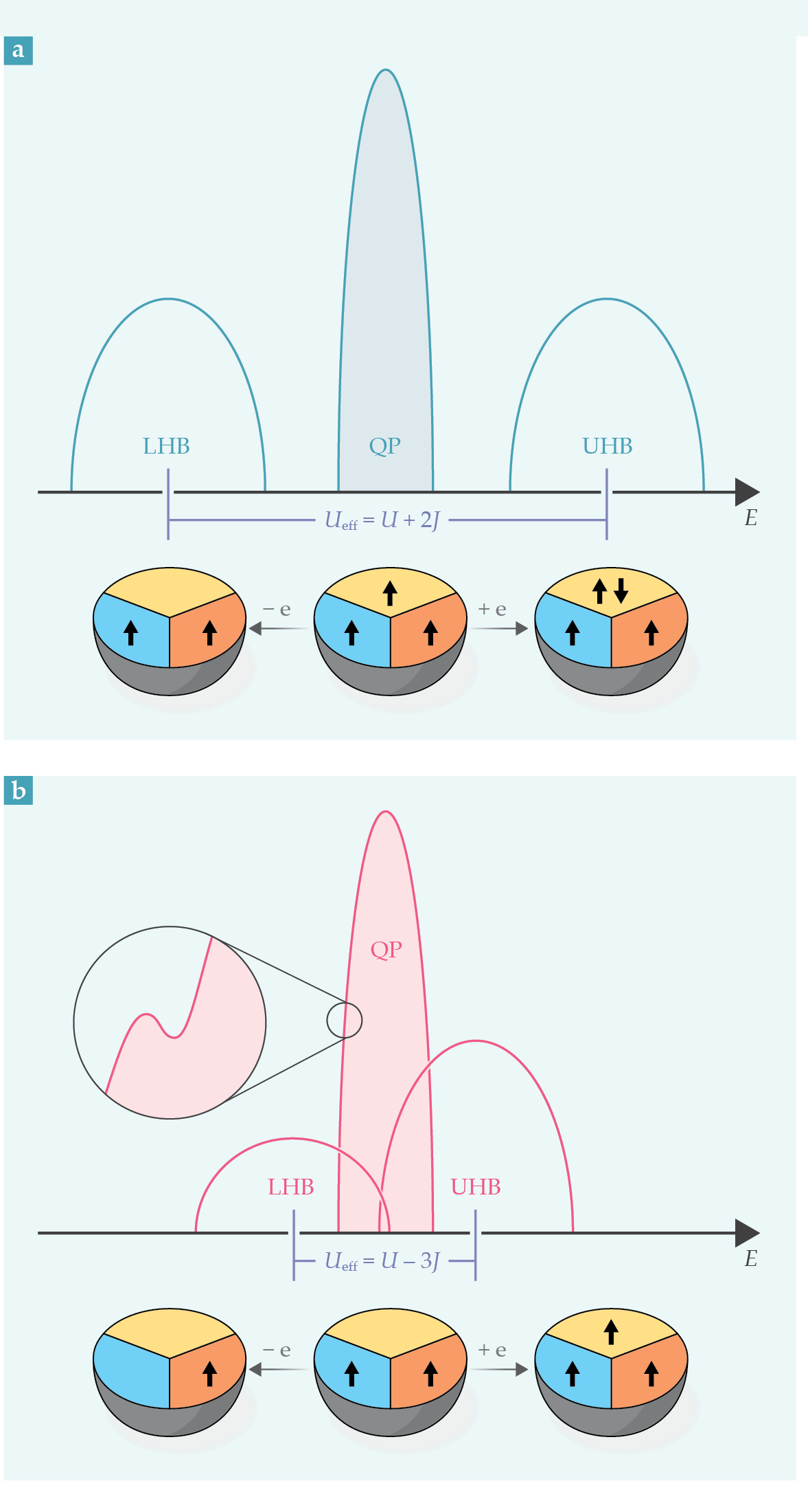 Excitations in three-orbital systems with (a) three electrons (a half-filled shell) in the ground state and (b) two electrons. Each electron is in a different orbital with parallel spins (bottom panels), in accordance with Hund’s rules. Removing or adding an electron produces a lower Hubbard band (LHB) and an upper Hubbard band (UHB) in the total density of states, plotted in the upper panels as a function of excitation energy E. The LHB and UHB are separated by an energy Ueff, the effective Coulomb interaction, which depends on the repulsion U for electrons in the same orbital and on the Hund coupling J, the energy change from aligning electron spins. For metals, the spectrum also contains low-energy quasiparticle (QP) excitations. When the Hund coupling is large, those excitations can overlap the Hubbard bands for non-half-filled shells. In such Hund metals, the QP peak has a substructure (inset).