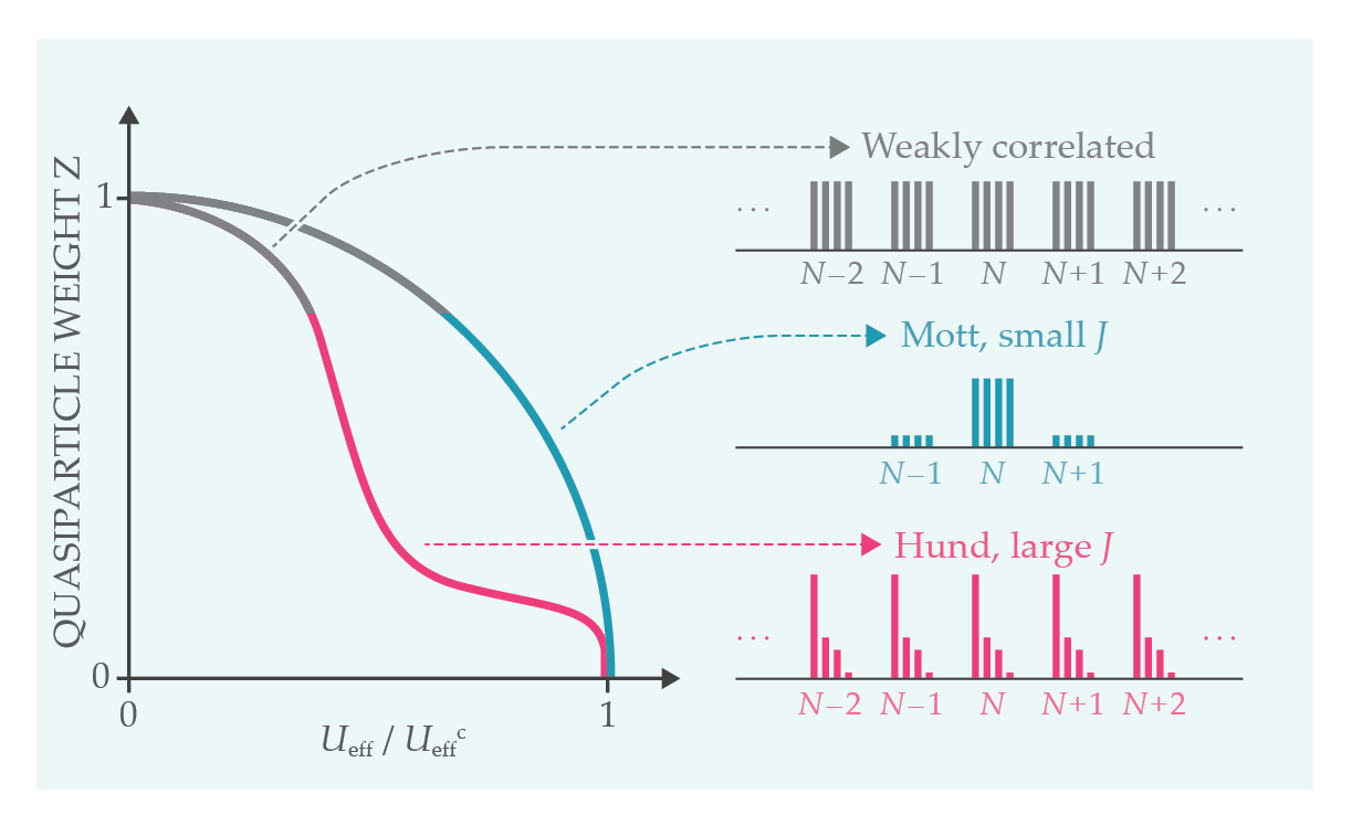 The quasiparticle weight Z—the probability that an electron removed or added to the ground state will be in a quasiparticle state—depends on Ueff /Ueffc, the ratio of the effective Coulomb energy Ueff to the critical value Ueffc at which the metal–insulator transition takes place. The plot compares three cases: a weakly correlated metal (gray), a strongly correlated metal close to the transition (blue), and a metal with substantial Hund coupling (pink). The Hund-metal regime has a characteristic plateau