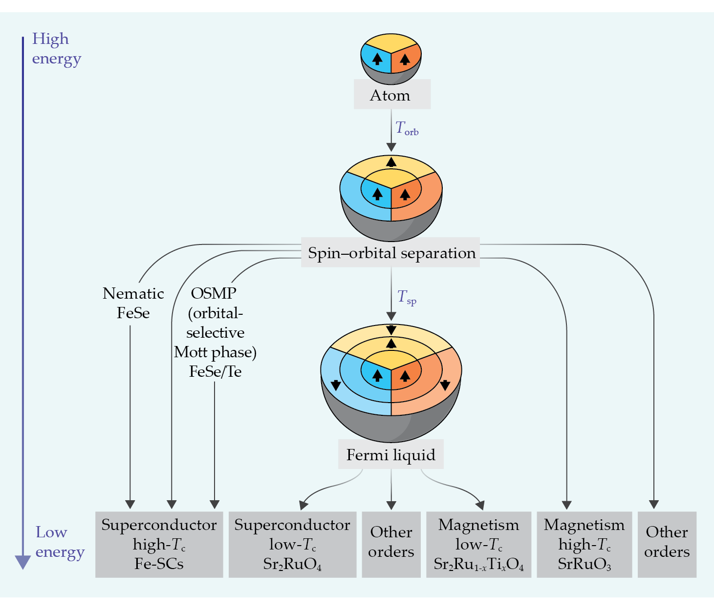 Evolution of a material’s active degrees of freedom as a function of energy. It goes from a high-energy regime (top), in which atoms fluctuate between different atomic configurations, to a low-energy regime (bottom), in which coherent quasiparticle excitations emerge. The dynamical mean-field description of the process is depicted here as an onion-like sequence of effective energy shells added to the isolated atom, pictured at top. In Hund metals, the quenching of orbital and of spin fluctuations occurs at distinct temperatures Torb and Tsp, respectively. Between Torb and Tsp, the spin–orbital separated regime, the orbitals are quenched but a higher spin (S = 3/2 here) remains. At low energy, the so-called Fermi-liquid regime, all orbitals and spin states are effectively filled by an equal number of electrons so that the atomic degrees of freedom no longer fluctuate. A large diversity of symmetry-breaking instabilities and long-range orders, such as superconductivity and magnetism, may emerge out of either regime.