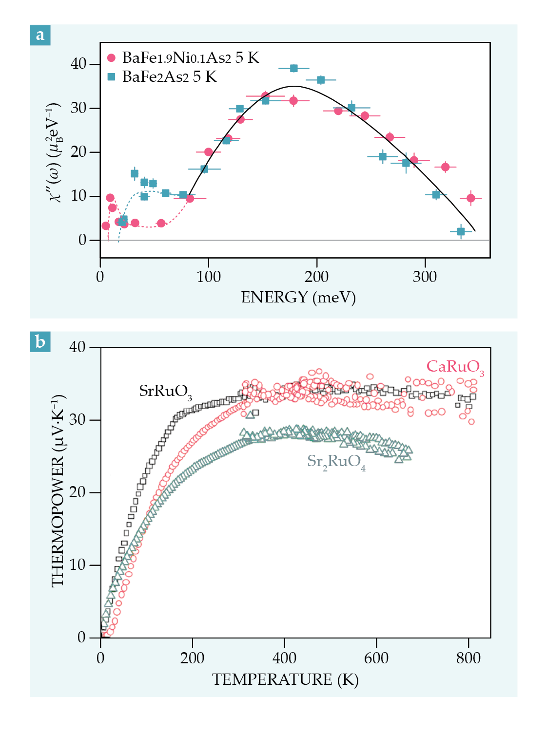 As noted by Yannick Klein, Sylvie Hébert, and coworkers from the CRISMAT laboratory in Caen, France, and confirmed by DMFT calculations, 15 that value can only be explained by considering that the spin degrees of freedom fluctuate while the orbital ones do not. Hence spin entropy provides the only contribution to the Seebeck coefficient. Inelastic neutron scattering experiments also reveal the presence of fluctuating local moments in Sr2RuO4, as signaled by a component of the magnetic response that depends weakly on momentum. As shown by DMFT, these local spin fluctuations are associated with Hund physics. 16