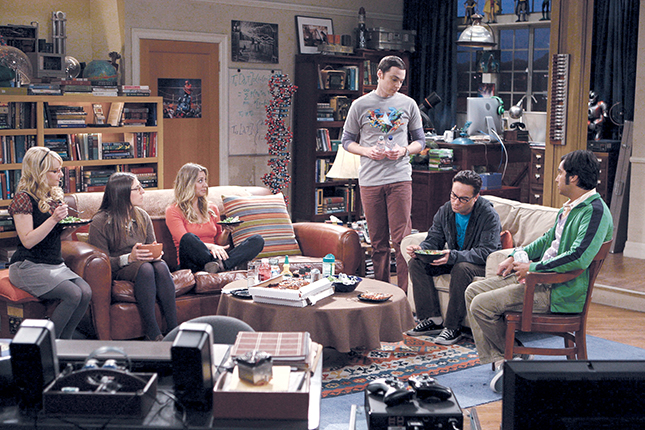 Figure 1. Hanging with Mr. Cooper. Six of the seven main characters on The Big Bang Theory share pizza and salad in the living room of Sheldon Cooper and Leonard Hofstadter. The domestic setting reinforces the “extended family” in the situation comedy. Note the gaming systems and pop-culture touches that appear in the set along with scientific models and whiteboards. (All photos courtesy of Warner Bros. Entertainment Inc.)