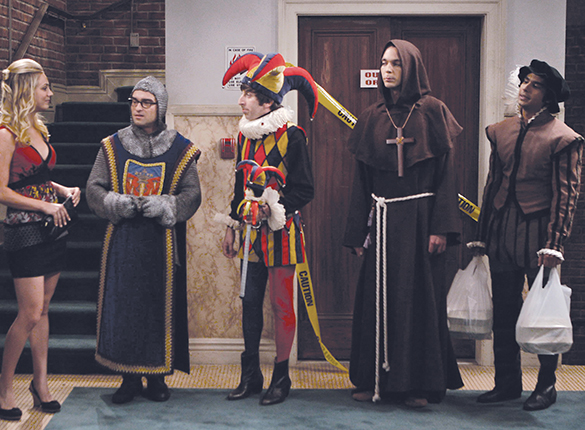 Audiences need to relate to a comedy’s core characters. By layering the set dressing with models, action figures, comic books, and posters, the producers and writers of The Big Bang Theory establish the characters’ geek “street cred.” In addition, the characters participate in tabletop, online, and console gaming. They not only attend fan conventions (“cons”) but also participate in elaborate costuming (“cosplay”), as illustrated in figure 2. Details gotten right serve as inside jokes for fans who enjoy seeing their hobbies portrayed on-screen. That authenticity has been reinforced with cameos by, among others, George Takei from the original Star Trek television program and films, Katee Sackhoff from the reenvisioned Battlestar Galactica series (2004–09), and James Earl Jones and Carrie Fisher from the movie Star Wars (1977).