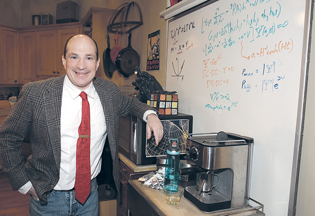 Figure 3. Scientific authenticity. UCLA physics and astronomy professor David Saltzberg poses with one of the whiteboards that he helps to fill with scientific and mathematical formulae. Saltzberg serves as a technical adviser for The Big Bang Theory along with Mayim Bialik, a PhD neuroscientist who both acts in the program and advises on life sciences. The show’s emphasis on scientific authenticity has made it distinctive.