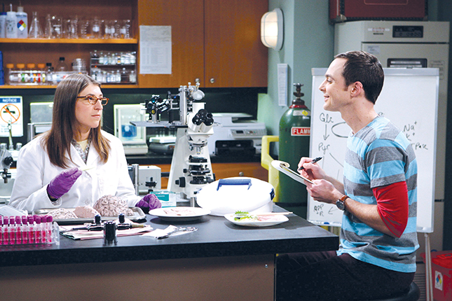Figure 4. Brainstorming. Sheldon Cooper joins Amy Farrah Fowler for lunch in her lab while she eats a sandwich and dissects a brain. The set, which features a complex microscope and equipment such as beakers, flasks, and test tubes, offers the uncommon vision of a life-sciences laboratory on a television comedy.