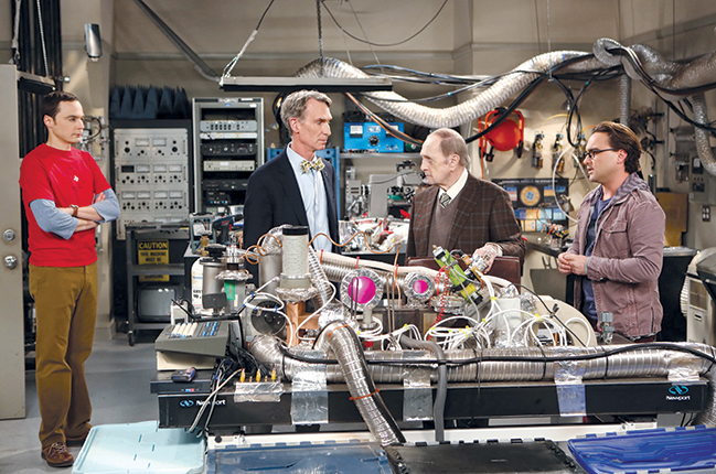 Figure 5. Honored guests. Occasionally scientists or science educators make cameo appearances on The Big Bang Theory. Here, Bob Newhart, playing science educator Professor Proton, and Bill Nye (the Science Guy), playing himself, visit Sheldon Cooper and Leonard Hofstadter in Leonard’s wire- and tube-laden lab.