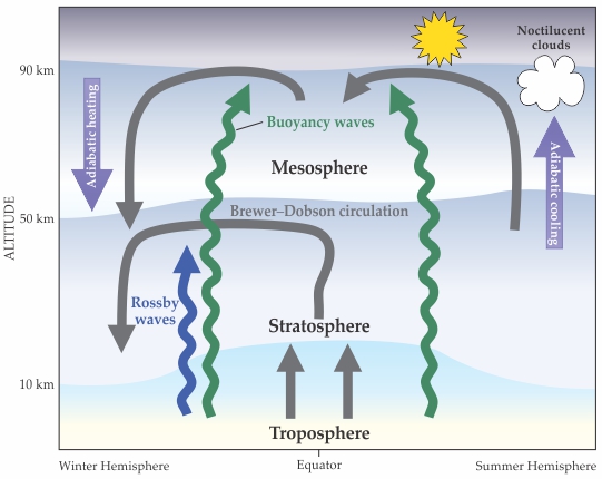 The troposphere, stratosphere, and mesosphere exhibit a rich and robust pattern of global currents. In the winter hemisphere, Rossby waves—generated when tropospheric winds interact with mountain ranges, weather systems, and temperature gradients at land–sea boundaries—drive a poleward flow known as the Brewer–Dobson circulation. Buoyancy waves, generated by smaller-scale disturbances such as thunderstorms, can propagate to the mesosphere, where they drive a poleward circulation in the winter hemisphere and an equatorward circulation in the summer hemisphere. The resulting upwelling and adiabatic expansion of polar air in the summer hemisphere chills the upper mesosphere to temperatures low enough to form noctilucent clouds, which, because of their high altitude, can remain visible through the night.
