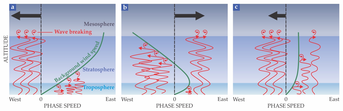 As buoyancy waves (red) propagate up from the troposphere, they grow in amplitude and eventually break, like ocean waves on a beach, and transfer their collective momentum (thick black arrows) to the background flow. However, if a wave’s east–west, or zonal, phase speed matches the background wind speed (green), it breaks prematurely. As a result, the spectrum of buoyancy waves driving the mesospheric circulation is determined by the velocity profile of the stratospheric background wind. (a) In the winter hemisphere, where strong, eastward stratospheric winds prevail, the mesospheric circulation is driven primarily by westward-propagating buoyancy waves. (b) In the summer hemisphere, where stratospheric winds flow westward, eastward-propagating buoyancy waves drive the mesospheric circulation. (c) The occasional weakening of the stratospheric circulation in the winter hemisphere allows some eastward-propagating waves to reach the mesosphere, which diminishes the westward buoyancy-wave forcing.