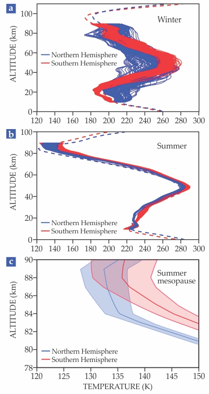 Atmospheric temperature profiles measured by the Aura satellite’s Microwave Limb Sounder during the winter polar night (a) and the summer polar day (b) reveal that winter temperatures are much more variable than corresponding summer temperatures, especially in the Northern Hemisphere. Counterintuitively, the coldest atmospheric temperatures are found in the summer, at the top of the mesosphere. In that region, known as the mesopause, (c) summer temperatures are more variable in the Southern Hemisphere than they are in the Northern Hemisphere. (The shaded areas denote standard deviations.) Data are averaged over latitudes of 68° and higher and are considered over the time range 2005–12; dashed curves in panels a and b correspond to simulated data produced with the Canadian Middle Atmosphere Model. (Data are available at http://climate-modelling.canada.ca/climatemodeldata/cmam/cmam30
