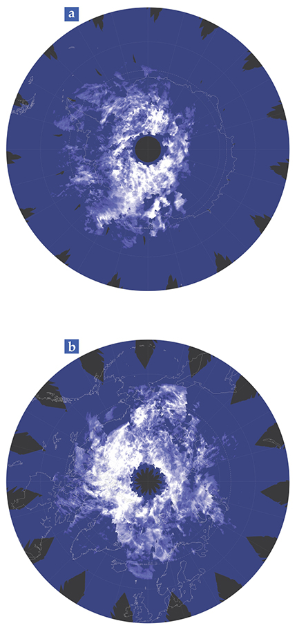 Noctilucent clouds above (a) the South Pole on 2 December 2009 and (b) the North Pole on 1 July 2009, as imaged by the Cloud Imaging and Particle Size instrument on NASA’s Aeronomy of Ice in the Mesosphere satellite. The imaged regions correspond to latitudes of 50° and higher. Noctilucent clouds in the Northern Hemisphere tend to be larger and brighter than their Southern Hemisphere counterparts. (Images courtesy of the Laboratory for Atmospheric and Space Physics at the University of Colorado Boulder.)