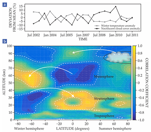 Studies of noctilucent cloud variability reveal rich interhemisphere correlations. (a) A plot of seasonal variations in noctilucent cloud cover in the summer mesosphere and corresponding temperature variations in the winter polar stratosphere suggests that the two quantities are correlated, with a correlation coefficient, r, of −0.86. The plot includes both July and January data, corresponding to peak noctilucent cloud cover in the Northern and the Southern Hemispheres, respectively. Cloud-cover data are from the Optical Spectrograph and InfraRed Imager System on the Odin satellite; temperature data are from the European Centre for Medium-Range Weather Forecasts reanalysis product ERA-Interim, accessible at http://apps.ecmwf.int/datasets