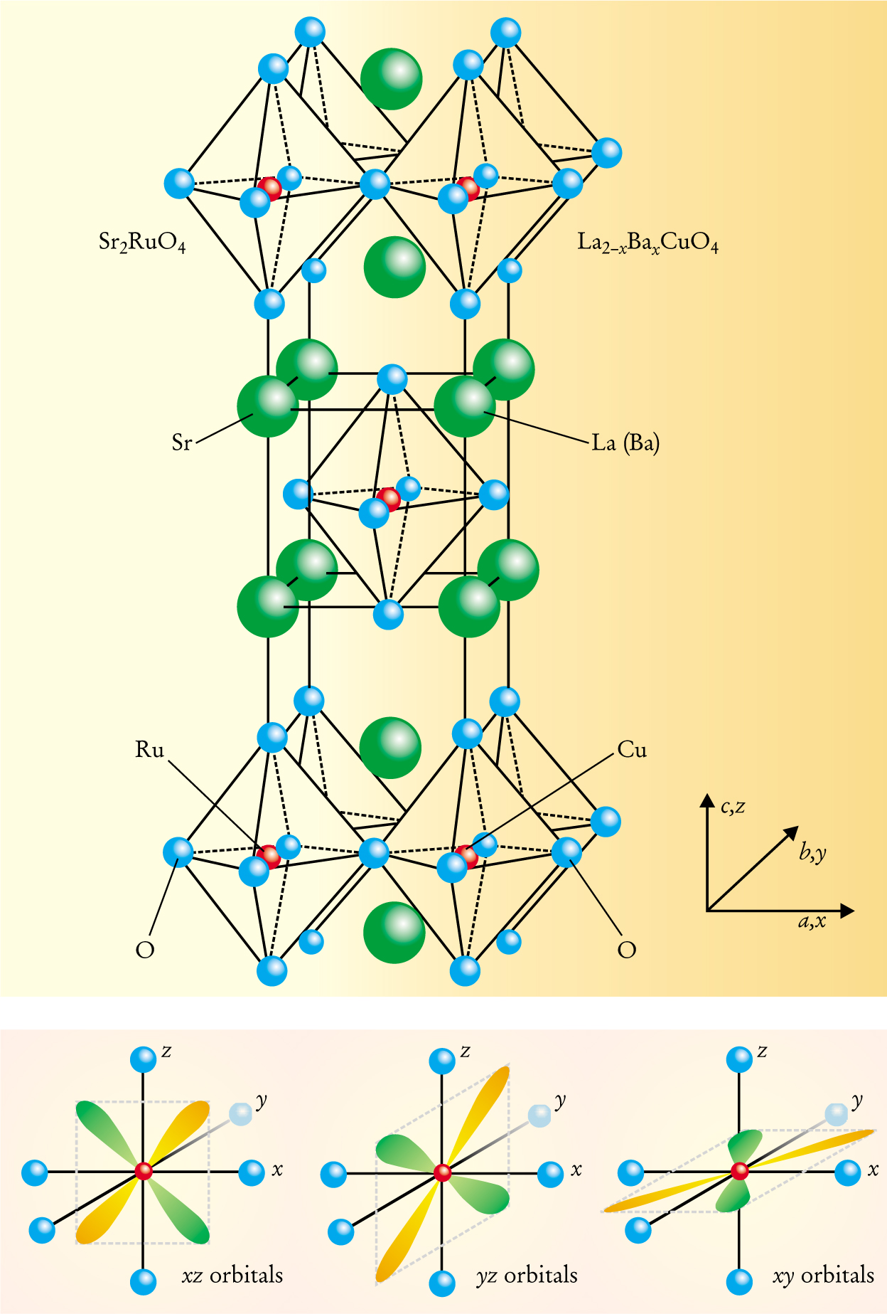 Figure 1. Strontium ruthenate (Sr2RuO4) forms a layered perovskite structure. As shown in the upper panel, the crystal’s RuO2 layers are separated by Sr layers, and each Ru ion is enclosed in an octahedral cage of oxygen ions. The same structure is also found in La2CuO4, which is the parent compound of the high-Tc superconductor La2−xBaxCuO4. Despite their structural similarity, the ruthenate and the cuprate have very different electronic properties: Sr2RuO4 is strongly metallic and a superconductor at low temperature, whereas La2CuO4 is an antiferromagnetic insulator. The lower panel shows the configuration of the orbitals responsible for the superconductivity of Sr2RuO4, namely, the 4d t2g orbitals.