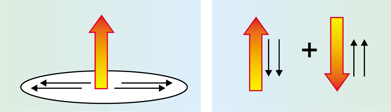 Figure 2. The superconducting states, corresponding to d(k)=z^(kx+iky) (left) and d(k)=x^kx+y^ky (right), have different spin orientations and total angular momentum. The z^(kx+iky) state has an angular momentum along the z-axis (thick arrow) and spin perpendicular in the plane (thin arrows). Its total angular momentum therefore has a value of 1 and points along the z-axis. The x^kx+y^ky state has vanishing total angular momentum because the orbital angular momentum is compensated by the spins of the Cooper pair. Both states represent equal-spin-pairing states, but have very different physical properties. Experiments identify the superconducting phase in Sr2RuO4 as being of the type in the left panel—that is, a state with finite angular momentum.
