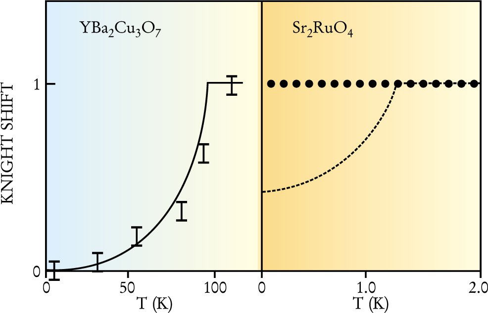 Figure 3. The knight shift for oxygen-17 in yttrium barium copper oxide (left) and strontium ruthenate (right). In materials whose superconductivity is mediated by spin-singlet Cooper pairing, Knight-shift data exhibit a drop in the spin susceptibility in the superconducting state. Such a drop occurs in YBa2Cu3O7, but not in Sr2RuO4, whose superconductivity is most likely mediated by spin-triplet Cooper pairs (the dashed line is a prediction based on spin-singlet Cooper pairing).