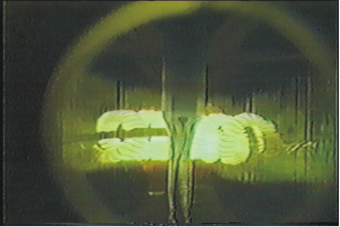 Figure 4. Growing a single crystal of strontium ruthenate by the floating zone method. A polycrystalline rod fed from the top is melted at about 2100 °C in the central zone, where elliptical mirrors focus the infrared power emitted from two halogen lamps. The crystal is extracted from below. Because the material is not in contact with any container, which is often the main source of contamination, the crystal can be made extremely pure.