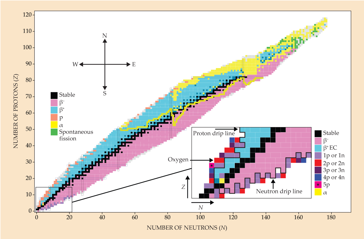 In fact, throughout the proton-rich metastable region, one-proton emission dominates for odd-Z values and two-proton emission for even Z (see the figure 1 inset). The zigzag pattern of the proton drip line results from the relative ease with which elements with an odd number of protons shed one proton. Elements with even Z are relatively resilient—their primary particle decay mode is to shed two protons.