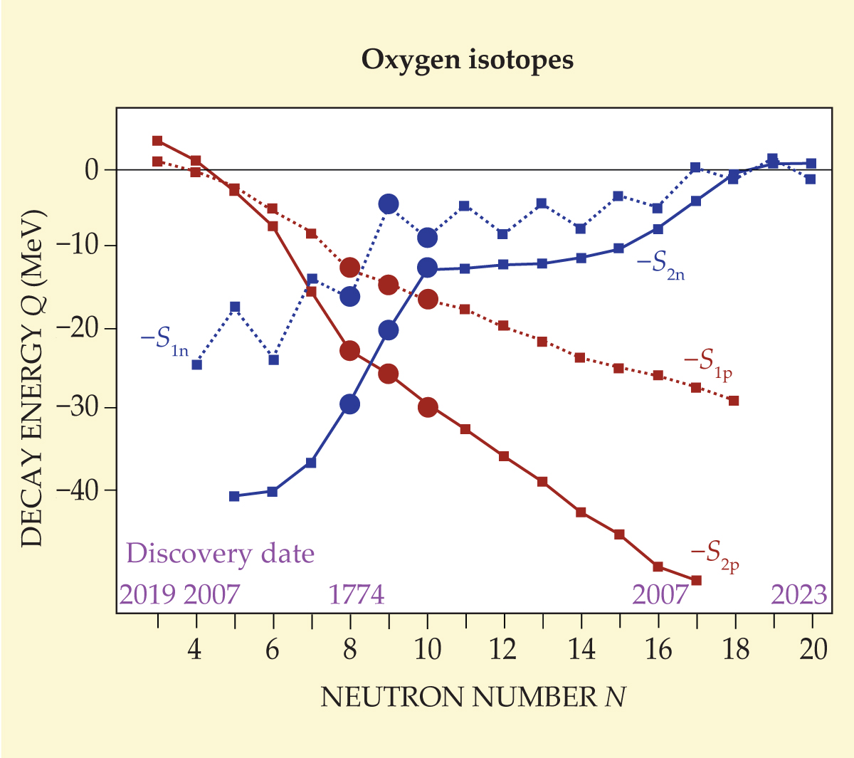 The energy required to remove one (S1n, S1p) or two (S2n, S2p) nucleons for each of oxygen’s isotopes. The nuclides 16O, 17O, and 18O (largest dots) are the only truly stable isotopes of oxygen because they are also stable to the weak interaction. Oxygen isotopes at lower and higher neutron numbers are unstable to weak decays. On the neutron-deficient side (left), the isotopes 11O and 12O are unbound to 1p and 2p decay. Below the solid horizontal line, the nuclei are stable with respect to particle emission, and some energy—quantified by the Q value—is needed to remove a nucleon from the nucleus. On the neutron-rich side, without a Coulomb barrier, the nuclei beyond 24O are ephemeral. Neutron-unstable 26O and 28O isotopes have small neutron separation energies and emit multiple neutrons. Only in recent years, with the discovery of 11O, 12O, and 28O, have researchers begun to study the zone of nuclear ephemera. (Experimental data taken from ref. 2.)