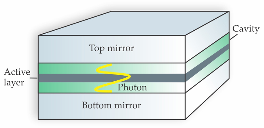 The quantum wells are usually sandwiched between two distributed Bragg reflectors, which act as the two cavity mirrors. Distributed Bragg reflectors consist of alternating layers of semiconductors having differing refractive indices. If each layer is a quarter of a wavelength thick, then the reflections from each interface interfere constructively. As the number of layers increases, the total reflectivity approaches unity.
