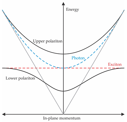 The dispersion relation for a photon in an optical cavity is parabolic for small in-plane momentum and converges to the free photon dispersion (gray lines) at large momentum. When one mode is tuned to the energy of an electronic excitation, or exciton, photon–exciton coupling inside the cavity gives rise to new hybrid modes (black), known as polaritons.