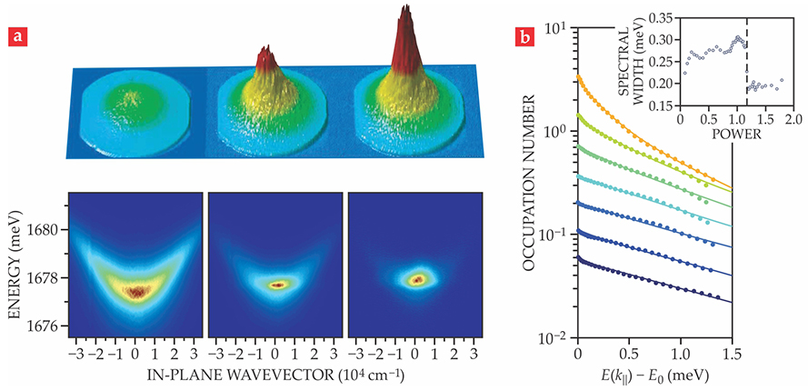 In those experiments, condensates were evidenced by the emergence of a sharp peak near the ground state in the momentum distribution as shown in figure 3a, a jump in the spatial and temporal coherence of the emitted light, and the spatial condensation of polaritons in a trap.
