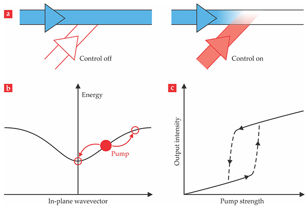 Optical switches can be achieved through various polariton-based schemes. (a) An optical transistor design exploits repulsive interactions between polaritons: The flow of source polaritons (blue) from left to right shuts off when a gate beam (red) is turned on and resumes when it is turned off. (b) Source polaritons injected into a cavity by a pump beam at an energy and momentum near the inflection point of the polariton dispersion curve can be stimulated by gate polaritons to scatter into low- and high-momentum states. (c) Due to a nonlinear relationship between polaritons’ energy and density, bistability of the output intensity can be obtained by using an appropriately tuned pump beam.
