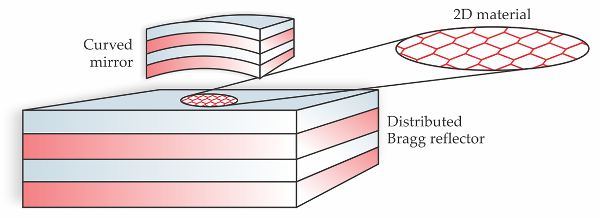 Unlike experiments with standard semiconductors, experiments with 2D materials are often performed in open optical cavities, with the top and bottom mirrors grown on separate substrates, and often with flakes of the active excitonic 2D material strewn on the bottom mirror. The top mirror is typically grown on a curved surface so that it can be scanned and focused on individual flakes, as illustrated in figure 5.