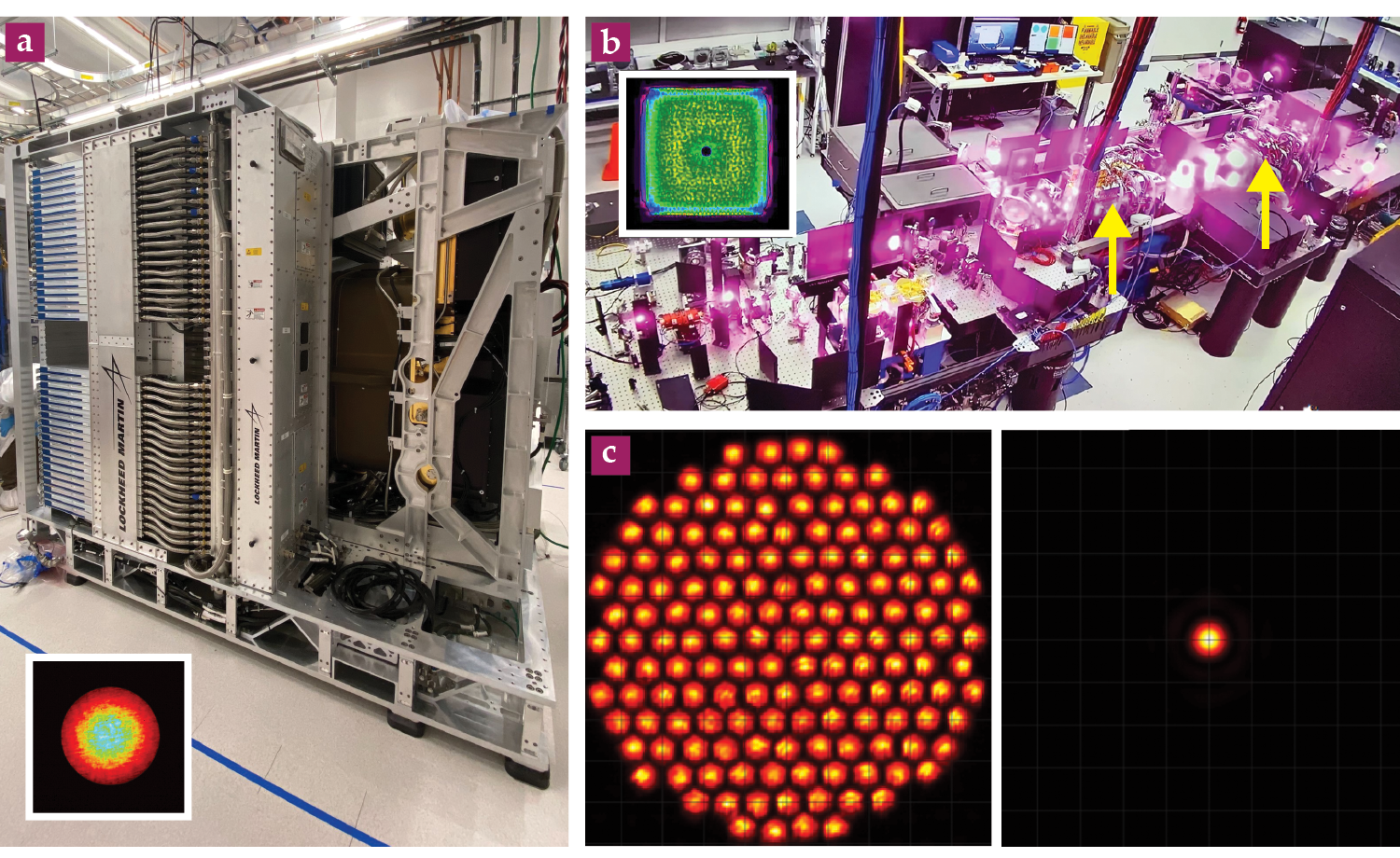 High-energy lasers, produced by the scaling initiative coordinated by the Department of Defense. (a) This photograph of Lockheed Martin’s 300 kW spectral combined fiber laser shows the edges of module boards (each of which contains a fiber laser), the pump diodes, and the control system. The inset shows the laser’s far-field near-Gaussian irradiance pattern. (b) General Atomics’ 300 kW distributed-gain laser is pictured in operation. Yellow arrows point out the compact laser-gain cells, and the inset shows the output beam’s uniform near-field irradiance pattern. (c) The near-field (left) and far-field (right) irradiance patterns show the high quality of nLIGHT’s 300 kW coherently combined fiber laser. (Photos and images courtesy of and adapted from the Naval Surface Warfare Center Dahlgren Division.)