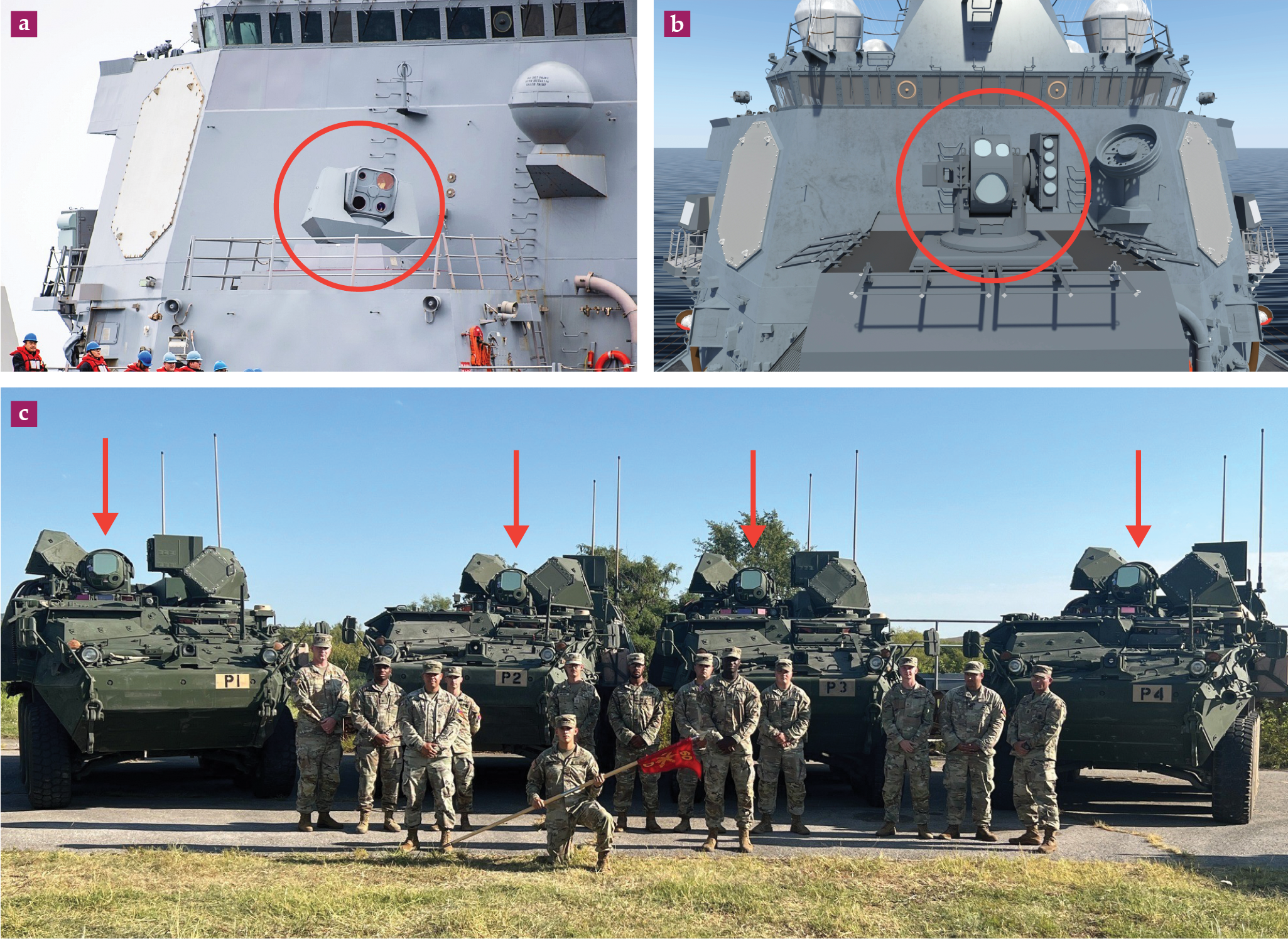 Mobile weaponry. (a) The Optical Dazzler Interdictor, Navy, on the USS Stockdale, is designed to blind adversarial IR sensors with a low-power laser beam. Circled are apertures for guiding the beam and tracking targets. (Courtesy of the US Navy/MCSN Elisha Smith.) (b) The 60 kW High Energy Laser with Integrated Optical-Dazzler and Surveillance is mounted on the USS Preble. Circled are the beam director (the large aperture at the bottom) and other apertures for tracking sensors and illuminating laser beams. (Courtesy of Lockheed Martin.) (c) The first platoon of four 50 kW US Army laser weapon systems in Fort Sill, Oklahoma. Red arrows point to each vehicle’s laser. (Courtesy of the US Army.)