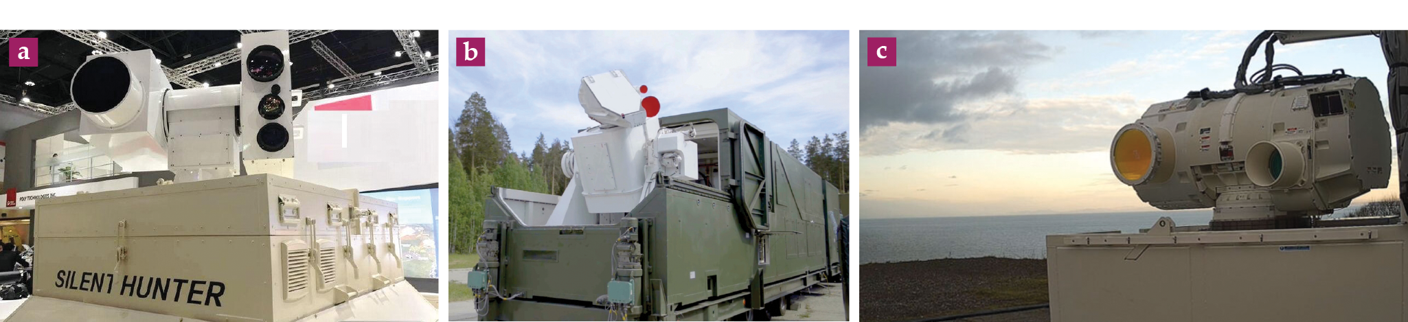 Non-US systems. (a) China’s Silent Hunter laser weapon is housed in a transportable container. Apertures contain the high-energy laser, tracking sensors, and illuminating lasers. (Courtesy of the Defense Systems information Analysis Center.) (b) Russia’s Peresvet “dazzler” weapon is mounted atop a transportable military container. The white beam director rotates about two axes to track a target in space. (Courtesy of the Russian Ministry of Defense, CC BY 4.0 DEED.) (c) The Dragonfire laser8 is the UK’s demonstration of a high-energy laser weapon. The larger aperture houses the weapon’s beam director, and the smaller aperture houses a tracking sensor. (Courtesy of MBDA.)