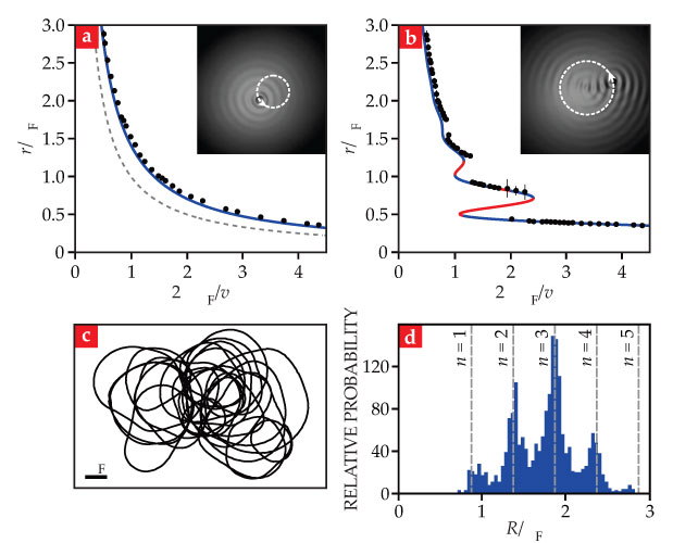 A few years later, my colleagues and I examined the high-memory regime of the rotating system both experimentally 11 and theoretically. 12 At high memory, virtually all orbital states become unstable, typically via a period-doubling transition to chaos. Figure 2c shows a typical chaotic trajectory, which tends to move along arcs whose radii of curvature correspond to those of the unstable orbits. Thus the trajectory’s radius of curvature is characterized by multimodal statistics, with peaks arising at integer multiples of λF/2, as shown in figure 2d. One can thus rationalize the quantum-like statistics in terms of chaotic pilot-wave dynamics: In its chaotic state, the walker switches between accessible unstable orbital states.