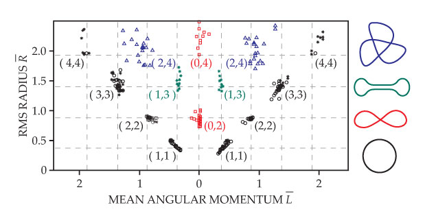 Figure 3. A walker in a harmonic potential. The observed orbits of a walker subject to a two-dimensional harmonic-oscillator force assume many shapes, including circles (black), lemniscates (red), dumbbells (green), and trefoils (blue). A double quantization emerges when the orbits of a walker of mass m and speed v are classified by