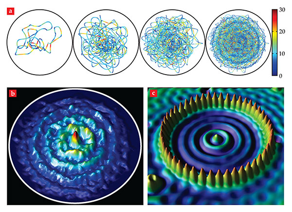 A couple of years ago, Couder’s group and mine joined forces to examine a walker in a circular corral. 15 We found that at low memory, the walker orbits along the bounding walls. As memory increases, the walker executes progressively more complex trajectories that include wobbling circular orbits, drifting elliptical orbits, and epicycles. At the highest memory we examined, the trajectories become irregular and chaotic, as shown in figure 4. Despite the complexity of the trajectories, a coherent statistical behavior emerges. Specifically, the histogram (figure 4b) of the walker’s position is roughly prescribed by the amplitude of the Faraday mode that arises when the bath is driven just above the Faraday threshold. If one views the concentric circular peaks evident in the histogram as orbital states of the system between which the walker switches when it is in a chaotic state, the multimodal statistics may again be rationalized in terms of chaotic pilot-wave dynamics. 16 That the walker system is closer to de Broglie’s mechanics than to Bohm’s is particularly evident in the corral, where the distinction between the complex pilot wave that guides the walker and the axially symmetric statistical wave is clear.
