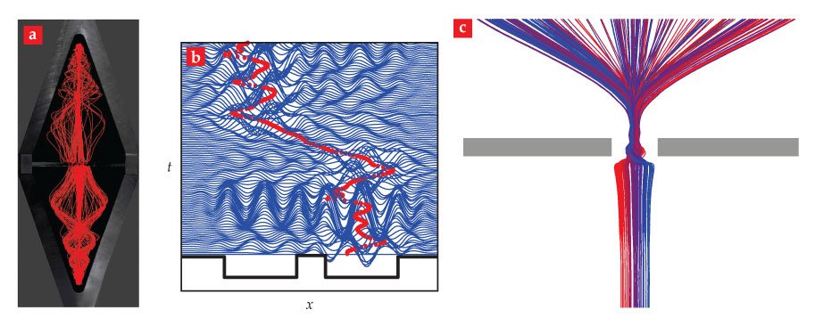 Couder and Fort demonstrated that when a walker passes through a slit—more precisely, over a gap in a submerged barrier—its rectilinear motion is disturbed, as illustrated in figure 5c, owing to the disruption of its pilot-wave field. 17 The behavior is analogous to that envisioned by de Broglie in his prediction of electron diffraction and in his rationalization of the position–momentum uncertainty relation. In the double-slit geometry, the pilot wave passes through both slits even though the droplet passes through only one. The walker thus interacts with both slits because of the spatial delocalization of its pilot wave.
