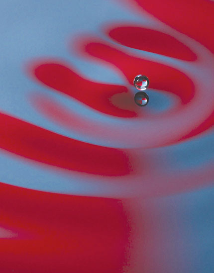 When a fluid bath is vibrated vertically, its surface becomes unstable to a field of so-called Faraday waves, such as shown in figure 1a, when the driving acceleration γ exceeds the Faraday threshold γF. As the threshold is crossed, the first waves to appear are subharmonic (having a frequency equal to half the driving frequency) with a wavelength λF determined by the dispersion relation for water waves. The phenomena of interest arise when a millimeter-sized drop is placed on a bath of silicone oil vibrating below the Faraday threshold, so the bath’s surface would remain flat if not for the drop. The drop may avoid coalescing with the bath owing to the persistence of a thin air layer between drop and bath during impact (see figure 1b). As the bouncing drop strikes the bath, the dominant force resisting its intrusion is that generated by the surface tension: The bath surface behaves roughly like a linear spring that reverses its direction.