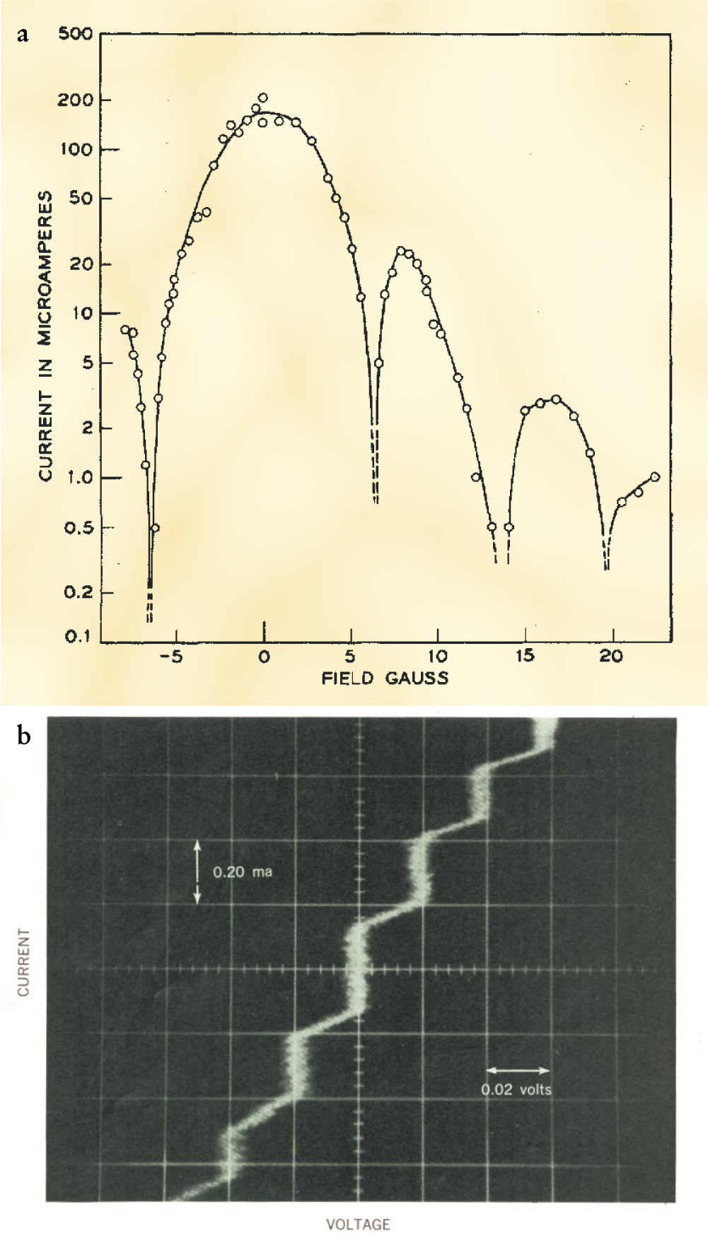 Figure 2. Experimental proofs of the Josephson effects. (a) Magnetic-field dependence of the supercurrent in the tunnel junction. (b) Sidney Shapiro’s demonstration of the I–V characteristic of a Josephson junction irradiated at 9.75 GHz