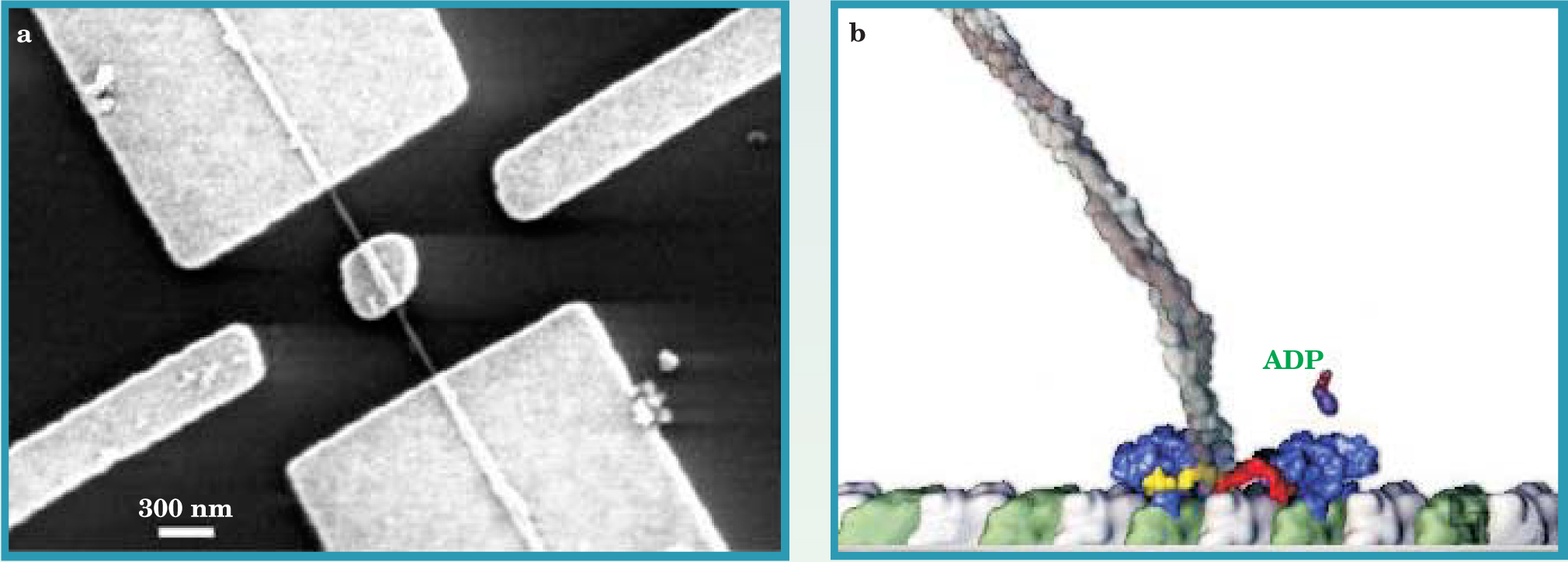 Figure 1. Nonequilibrium small systems. (a) In this scanning electron microscope image of an integrated synthetic actuator, the central metal-plate rotor is attached to a multiwalled carbon nanotube (MWNT) that acts as a support shaft. Electrical contact to the rotor plate is made via the MWNT and its anchor pads. A synchronized electrostatic force can induce rotary motion about the axis of the MWNT. (b) This artist’s rendition, based on crystallographic studies, shows a kinesin motor walking along a microtubule in a hand-over-hand (blue regions) fashion to carry organelles and other cargo from one part of the cell to another. Every step of the motor involves the hydrolytic conversion of chemical energy from adenosinetriphosphate into mechanical work. The reaction cycle is completed with the release of the hydrolysis product, adenosinediphosphate (ADP). Each of the motor’s hands is about 5 nm long.