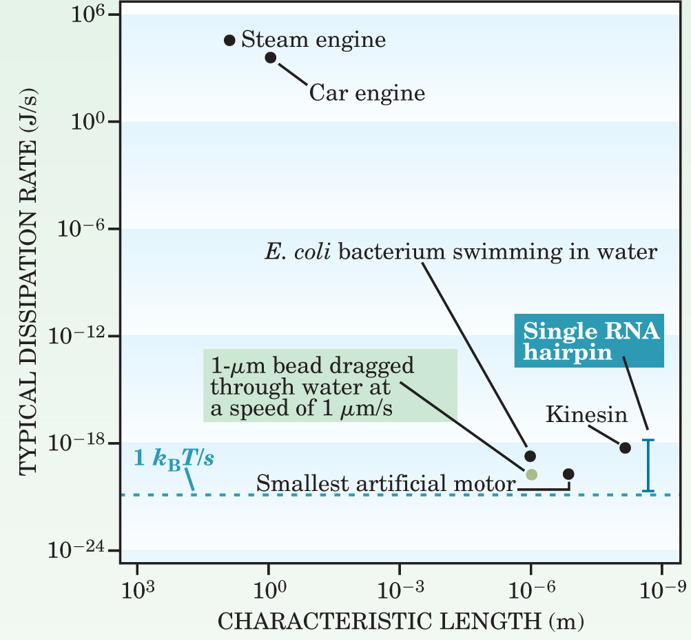 Figure 2 shows various thermal systems classified according to their size and typical dissipation energy rate, along with a couple of macroscopic systems for comparison. Most of the small systems are characterized by length scales in the nanometer-to-micrometer range and dissipation rates of 10–1000 kBT/s.