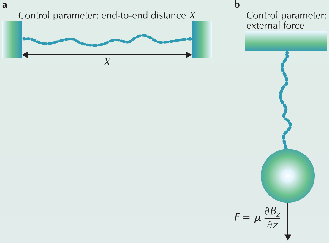 Figure 3. Control parameters for a stretched polymer. (a) The end-to-end distance X is the fixed control parameter. In experiments, one can vary X by moving the walls. When X is the control parameter, the force acting on a bead that attaches the polymer to the wall is a fluctuating variable. (b) Here the polymer is fixed at one wall and the control parameter is the force acting on a bead attached to the polymer at its free end. Experimentally, one can fix that force by using a magnetic bead with magnetic moment equal to μ and applying a uniform external magnetic field gradient ∂Bz/∂z. By changing the value of the gradient, one controls the force F acting on the bead. For a fixed F, the polymer’s extension is a fluctuating variable. In general, the relation between force and extension for a small system whose response is not linear will depend on which variable is the control parameter and which is allowed to fluctuate.
