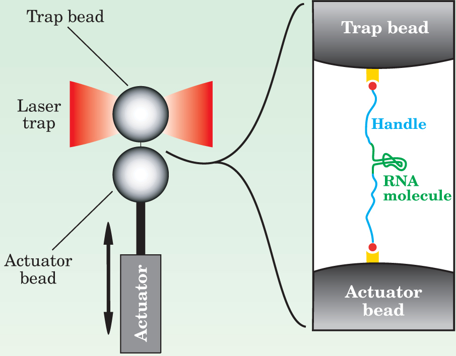 Figure 4. Testing the Jarzynski equality. A molecule of RNA is attached to two beads and subjected to reversible and irreversible cycles of folding and unfolding. A piezoelectric actuator controls the position of the bottom bead, which, when moved, stretches the RNA. An optical trap formed by two opposing lasers captures the top bead, and the change in momentum of light that exits the two-beam trap determines the force exerted on the molecule connecting the two beads. The difference in positions of the bottom and top beads gives the end-to-end length of the molecule. The blowup shows how the RNA molecule (green) is coupled with the two beads via molecular handles (blue). The handles end in chemical groups (red) that can be stuck to complementary groups (yellow) on the bead. The blowup is not to scale: The diameter of the beads is around 3000 nm, much greater than the 20-nm length of the RNA.