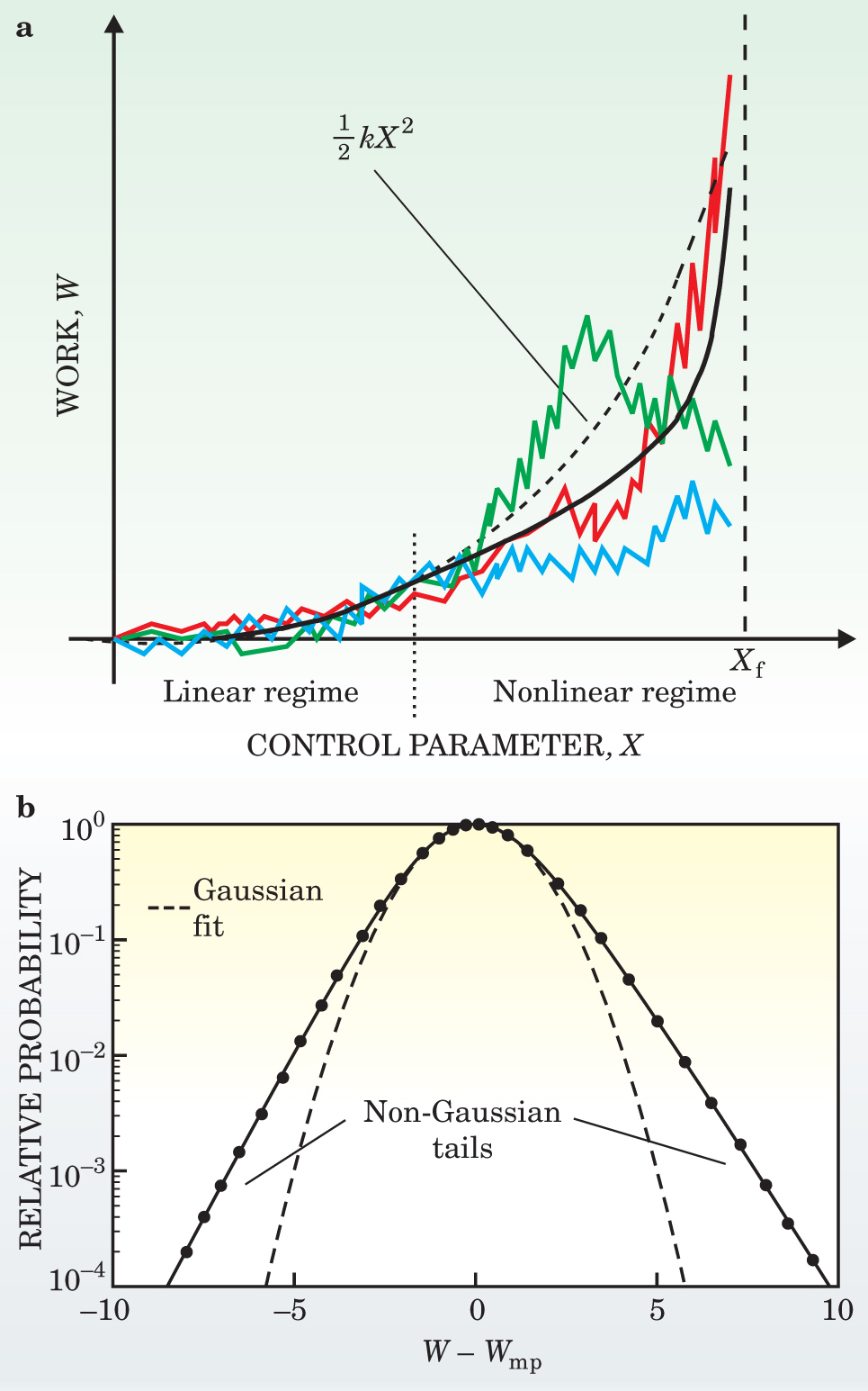 Figure 5. The nonlinear regime. (a) The work required to stretch a short polymer is a fluctuating function. The plot shows three different nonequilibrium trajectories obtained as the control parameter X varies from 0 to Xf. The continuous black line is the work averaged over all trajectories. The dashed line is the linear behavior described by the quadratic function W = (1/2)kX2. The size of work fluctuations and the deviations of the average work from the dashed line are greater in the nonlinear regime than in the linear regime. (b) In the nonlinear regime, the work probability distribution P(W) has a Gaussian component plus long non-Gaussian tails describing rare processes. Such a mix of Gaussian and non-Gaussian behavior has been seen in the power fluctuations in resistors, the relaxation of glassy systems, Rayleigh–Bernard convection, turbulent flows, and energy fluctuations in granular media. The existence of linear and nonlinear processes occurring along different time scales is reminiscent of the phenomenon of intermittency in turbulent flows and suggests an interesting link between apparently unrelated physical phenomena. In the plot, the zero of the horizontal axis is the most probable (mp) work and the energy unit is kBT. The black dots represent an analytical solution for a nonlinear two-state system, and the solid curve is a non-Gaussian fit.